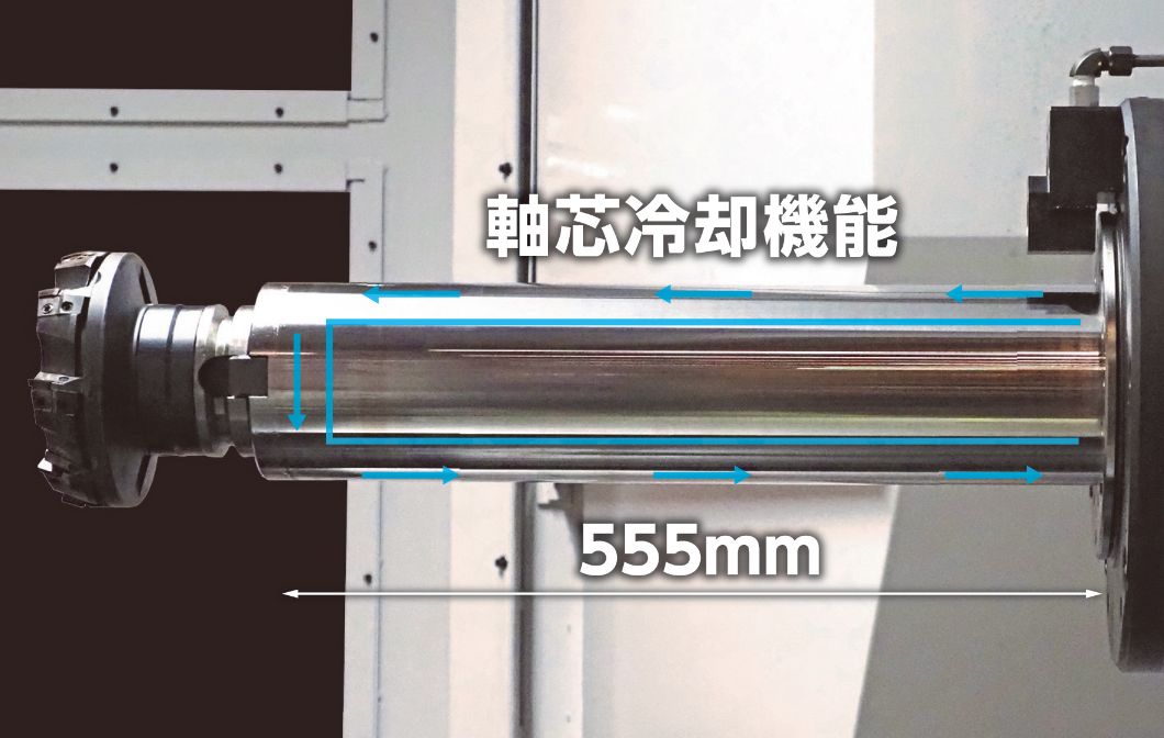 このクラス最大のW軸主軸径φ130mm、ストローク555mmのバーヘッドを搭載し、中ぐり加工を強力にサポートします。さらに、熱変位を大幅に抑制する軸芯冷却システムを標準装備し、熱変位を従来の1/4削減。角スライド・コラムトラバースタイプの機械構造との相乗効果により、難削材の中ぐり加工においても優れた加工能力を発揮します。