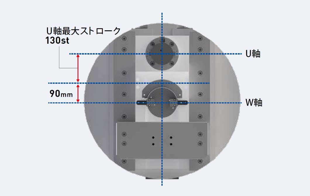 ターニング加工用スライド面板(U軸)とマシニング用繰り出し軸(W軸)の両方を搭載し、フェーシング、溝入れ、テーパ、中繰り、ミーリング、ドリル加工等多彩な加工を連続自動で行えます。