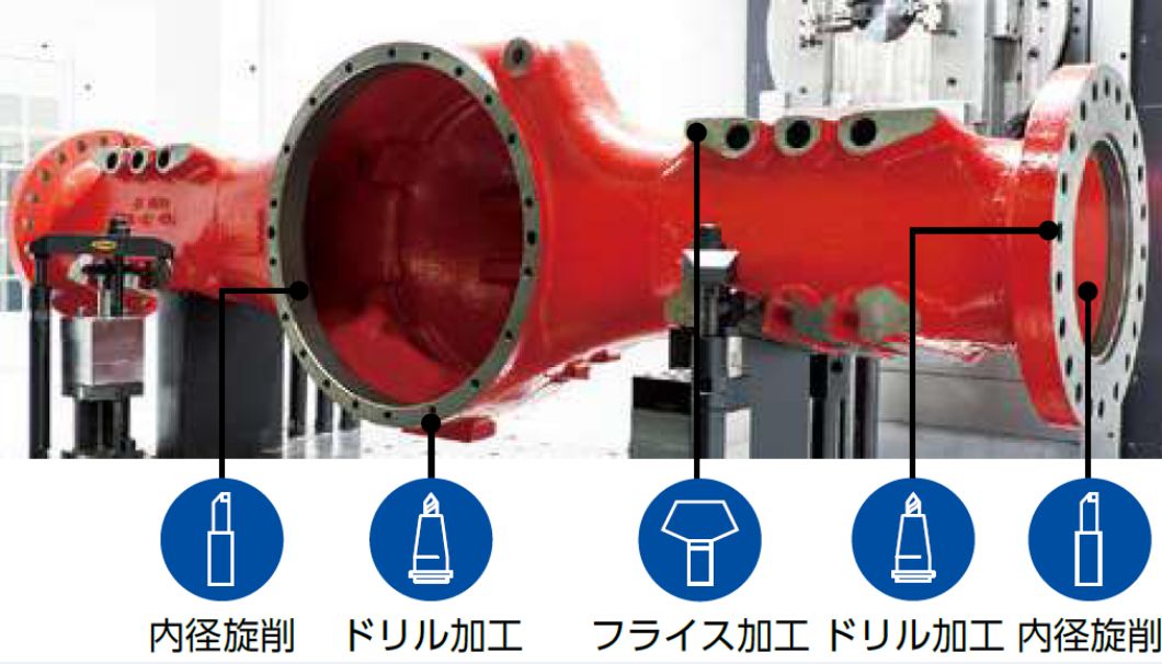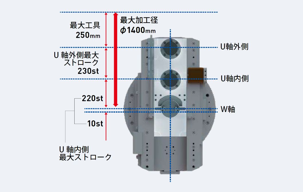 抜群のU軸ストロークで大径から小径まで一種類の工具で加工可能。