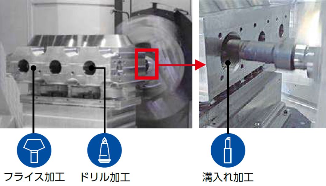 これまで複数台にわたっていた工程を1台に集約することで、段取り時間を大幅に短縮し、加工精度も向上。お客様の生産性を飛躍的に向上する複合加工機です。
